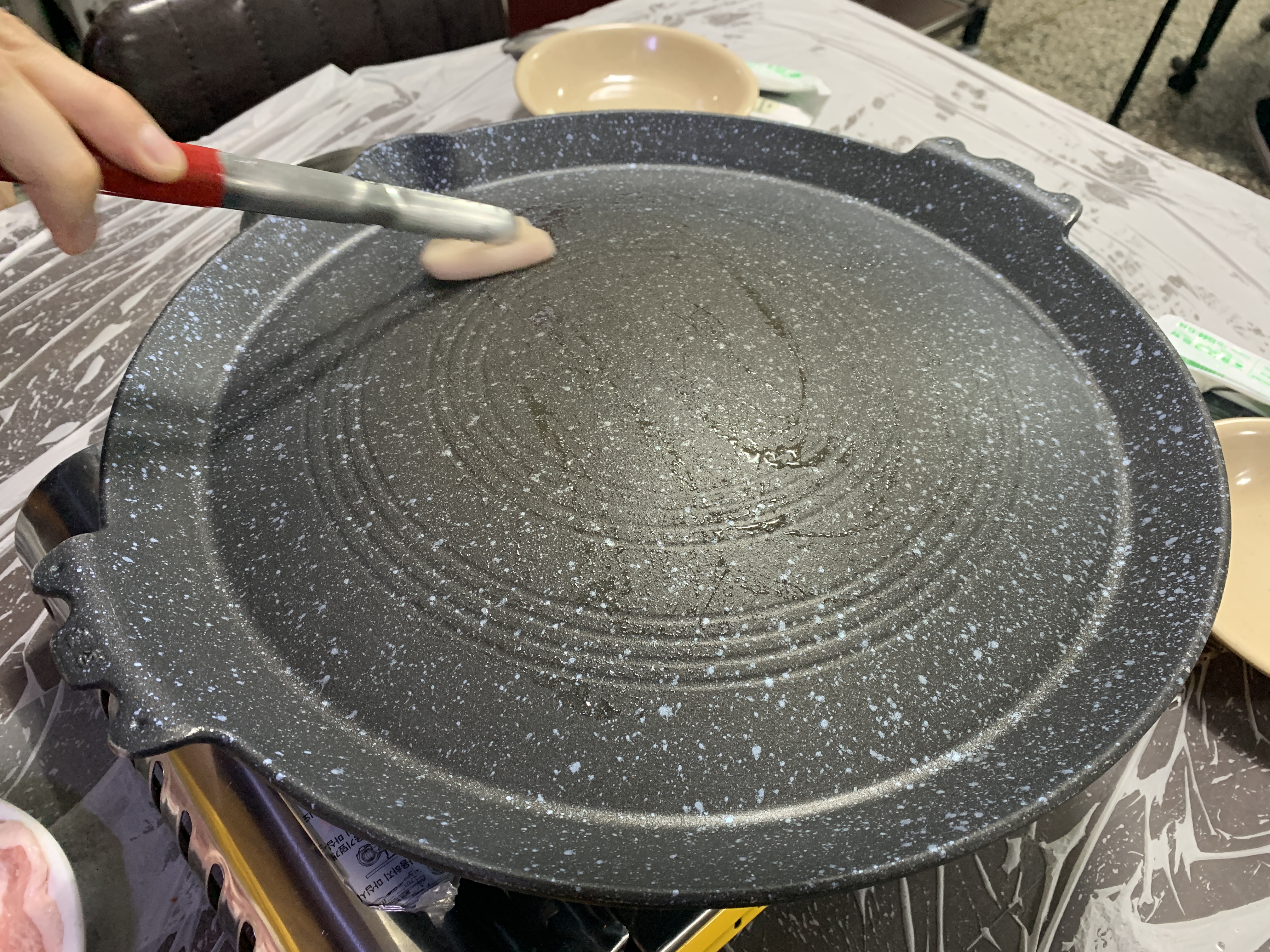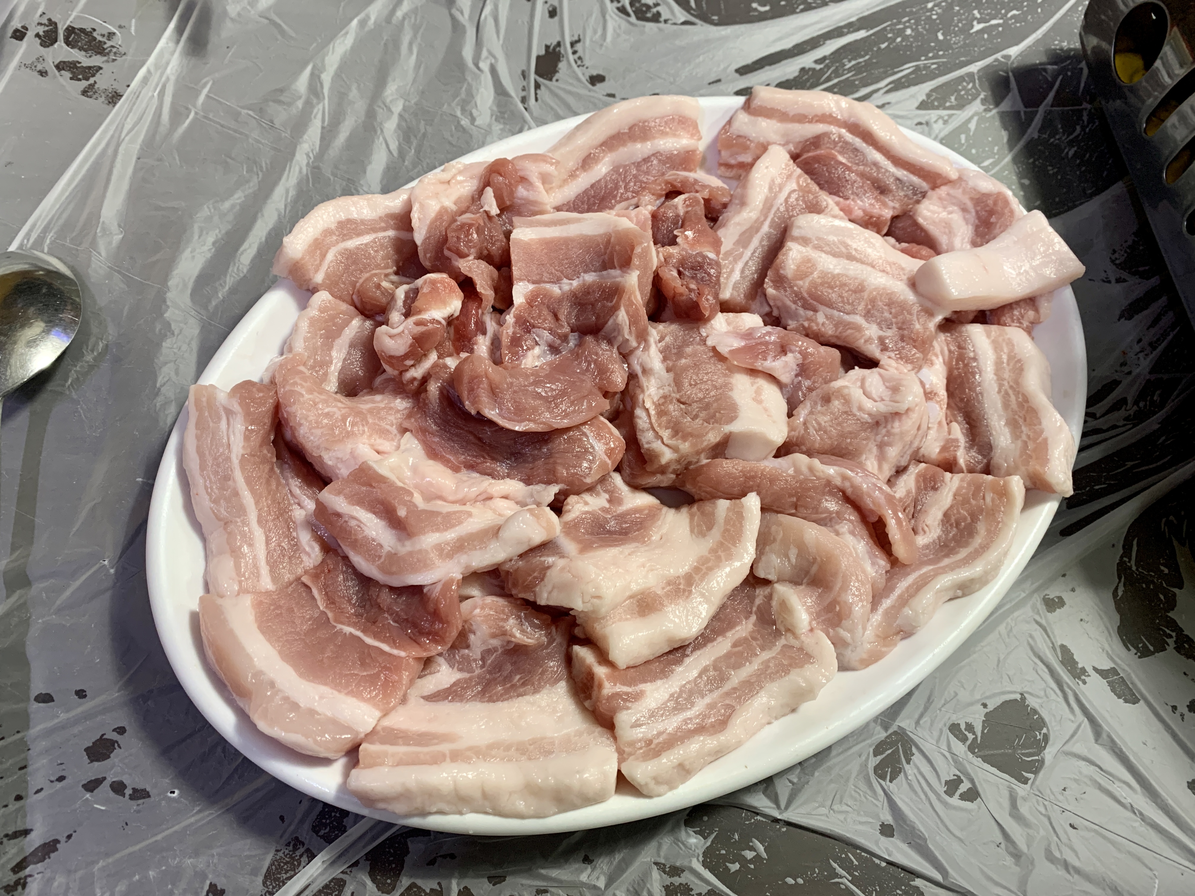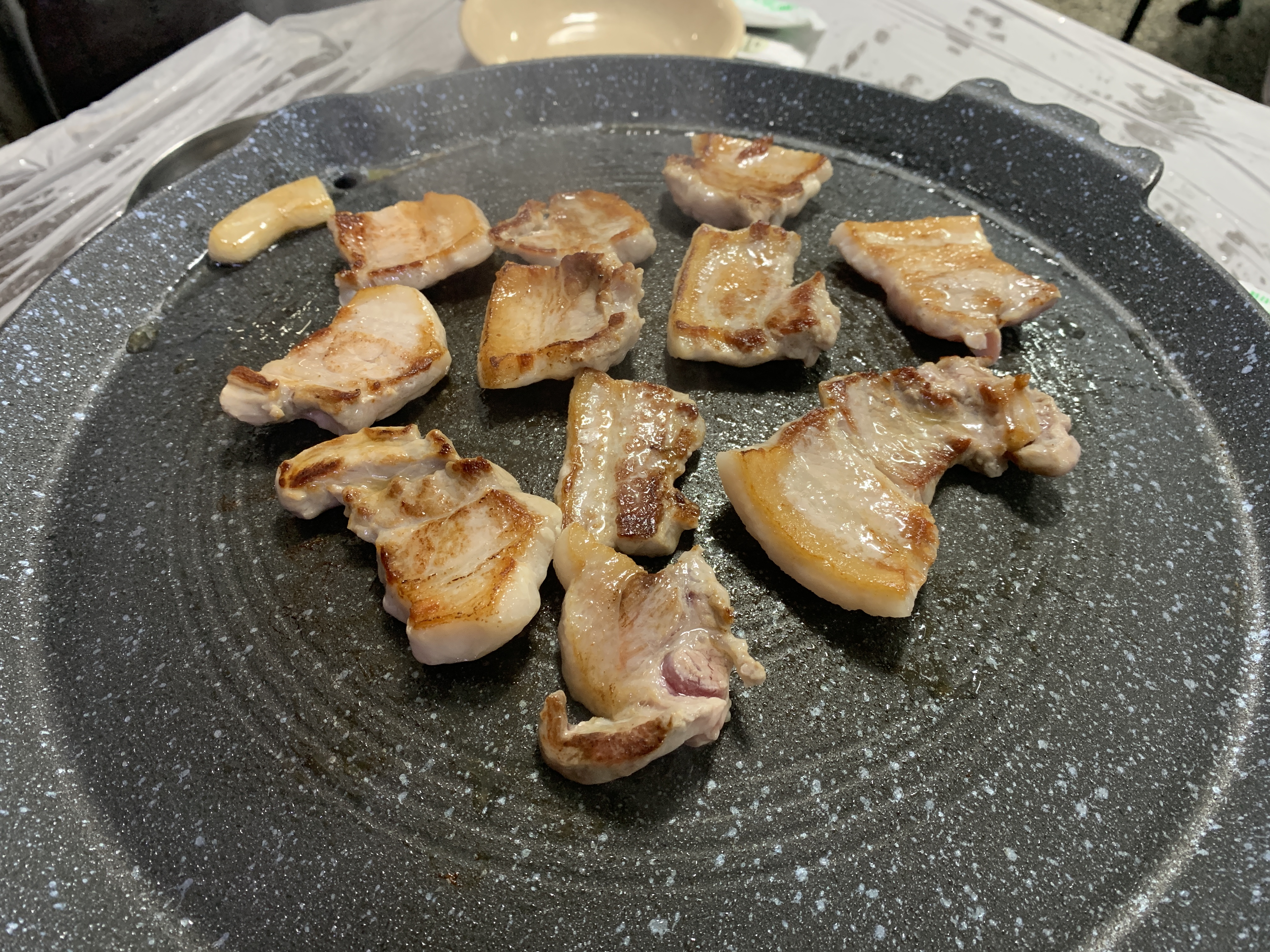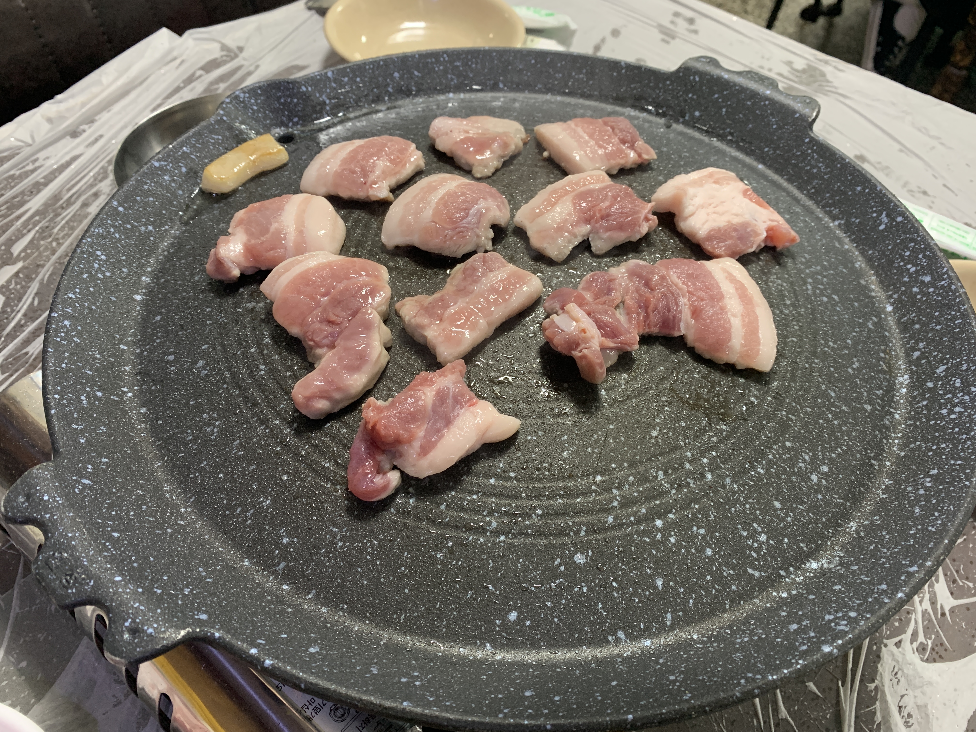 메뉴판은 없었지만 대충 고기는 1근/반근 단위로 판다고 들어서 주문한 삼겹살 1근. 겉보기엔 1근 치고는 양이 적다고 생각했는데 그 진가는 두께에서 드러났다.